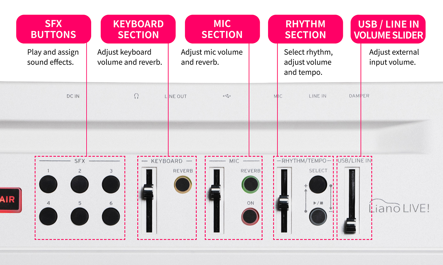 Both the keys and the microphone feature independent reverb controls with three levels each, so you can add just the right amount of ambience to your playing and your voice.