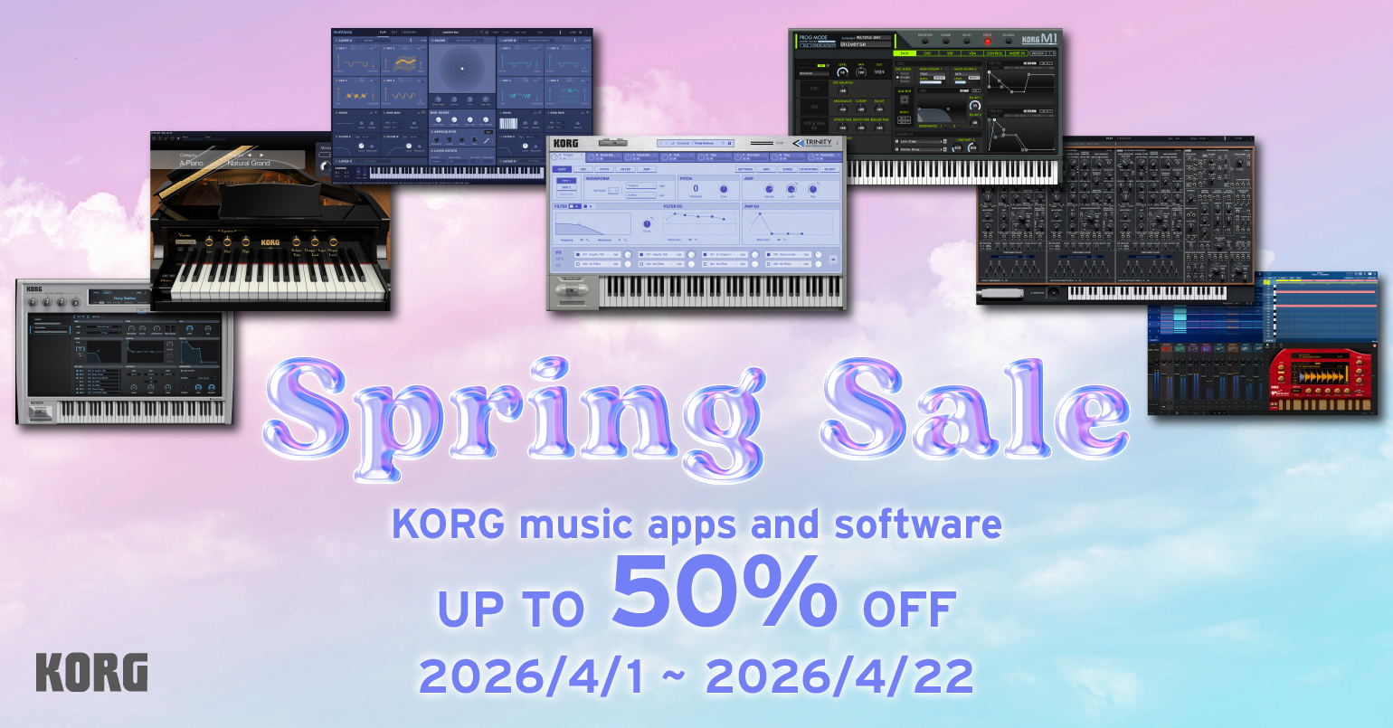 We are launching a Spring Sale with up to 50% OFF all KORG music apps & software! KORG Collection series, KORG Gadget 3, multi/poly native, opsix native, wavestate native, modwave native, iOS/Android apps, and in-app items are all included. Spring is the perfect opportunity to take your creativity even further. Sale ends this April 22, 2026.