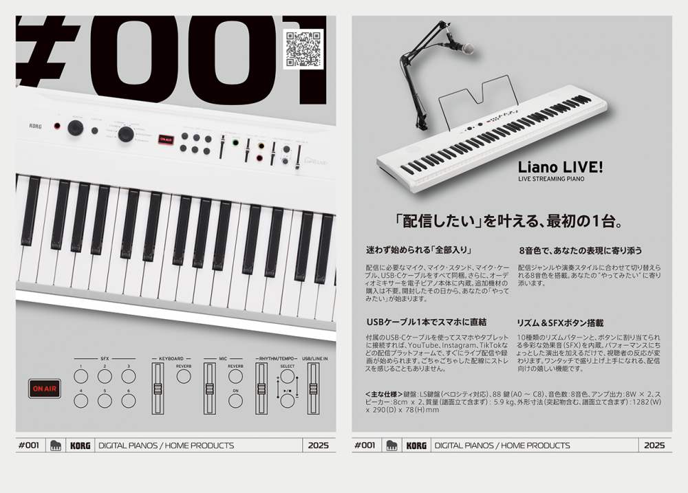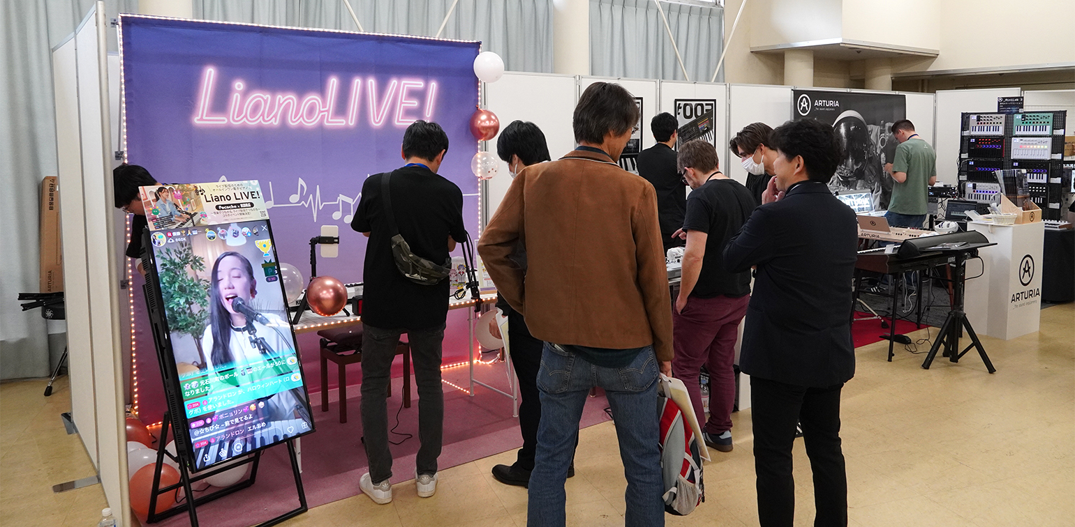 全体を3等分にし、コルグ2枠、ARTURIA1枠で配分。向かって左側のコルグ枠に10月発表したばかりのコルグ・デジタル・ピアノの新製品「 LianoLIVE !」を設置。配信に最適化した新しい製品コンセプトを伝えるべく、画面が映える装飾にしました。手前に話題の handytraxx playも展示。