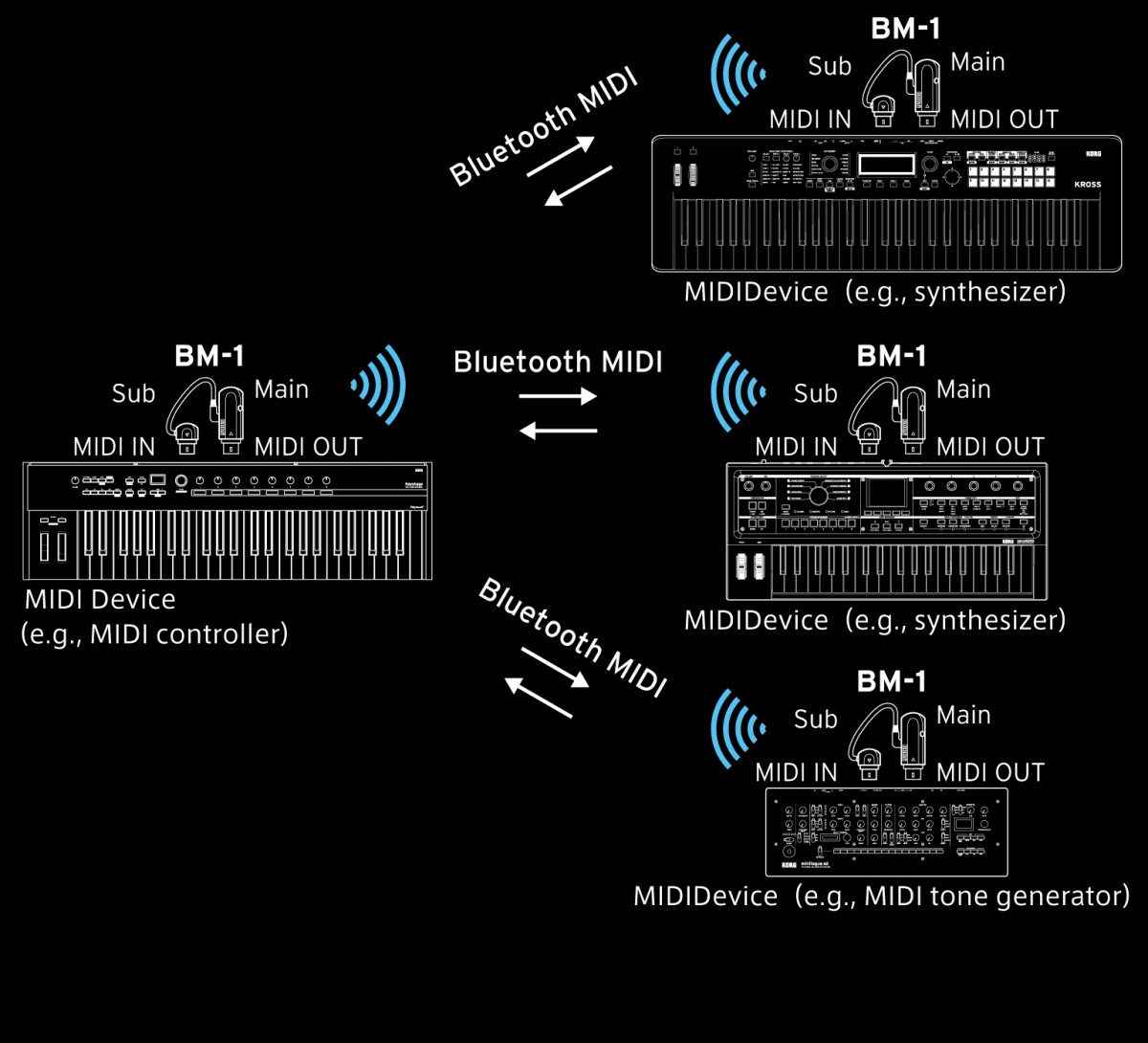 専用アプリ「KORG BM-1」を使用すれば、最大5台のBM-1をグループ化して、機器間でMIDI信号を送受信できます。