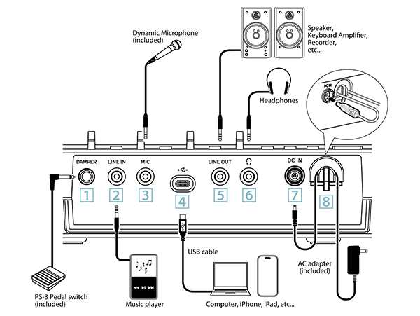 Zowel de toetsen als de microfoon hebben onafhankelijke reverb-regelaars met elk drie niveaus, zodat je precies de juiste hoeveelheid ambiance aan je spel en je stem kunt toevoegen.