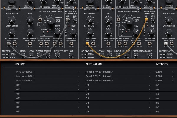 The KORG Collection PS-3300 includes three different mechanisms for MIDI control. First, you can introduce MIDI signals directly via the patch panel, including aftertouch, mod wheel, pitch bend, and the X-Y Manipulator. There’s also a 30-slot mod-matrix for modulating parameters from MIDI sources. Finally, MIDI Mapping lets you directly move sliders, knobs, and buttons from your favorite MIDI controller.